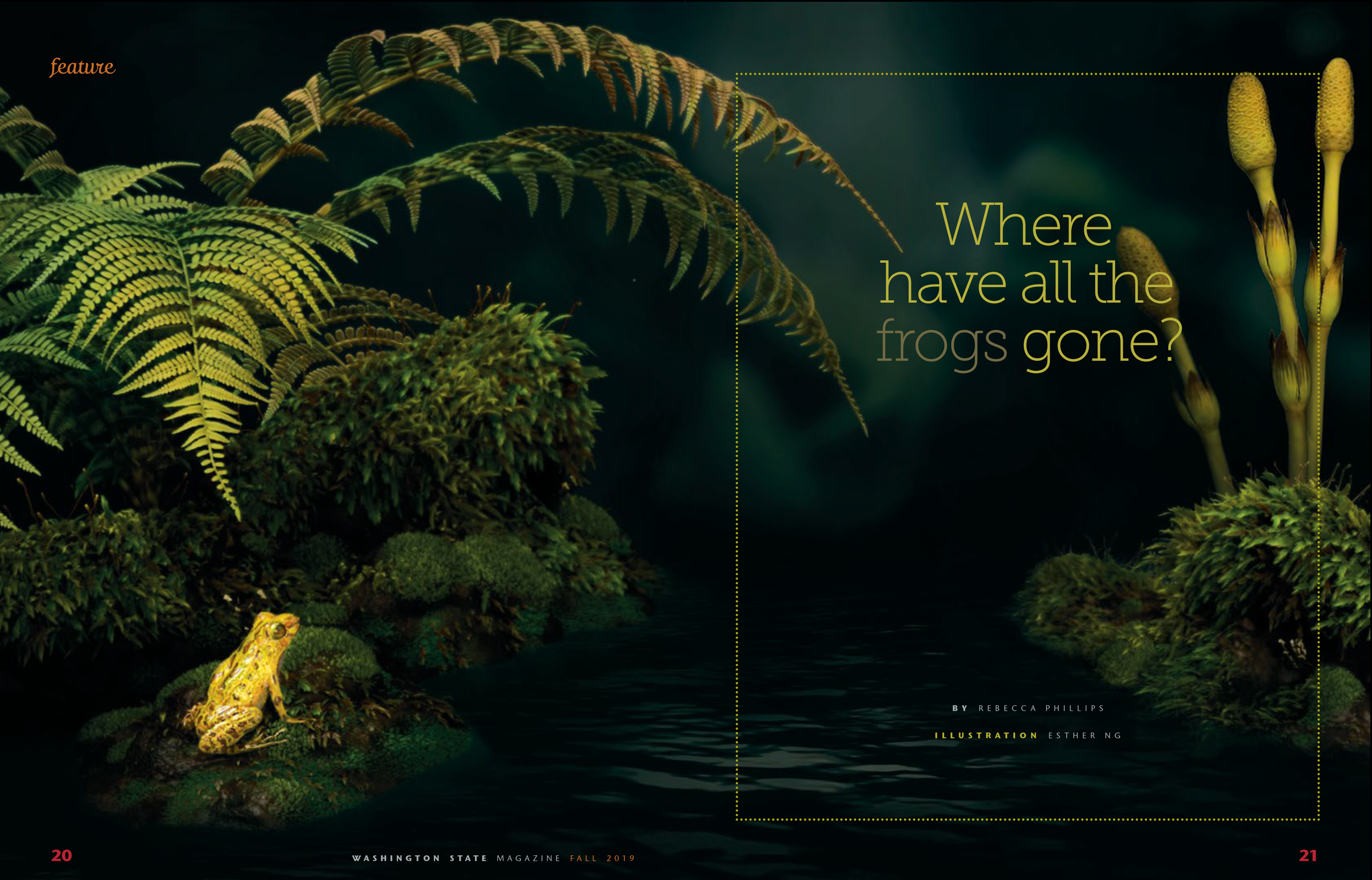 An spread illustration created for Washington State Magazine accompanying their article “Where have all the frogs gone?”, where the issue of Northern Leopard Frog being endangered was raised, due to habitat loss, invasive species, disease, pollution, and climate change.